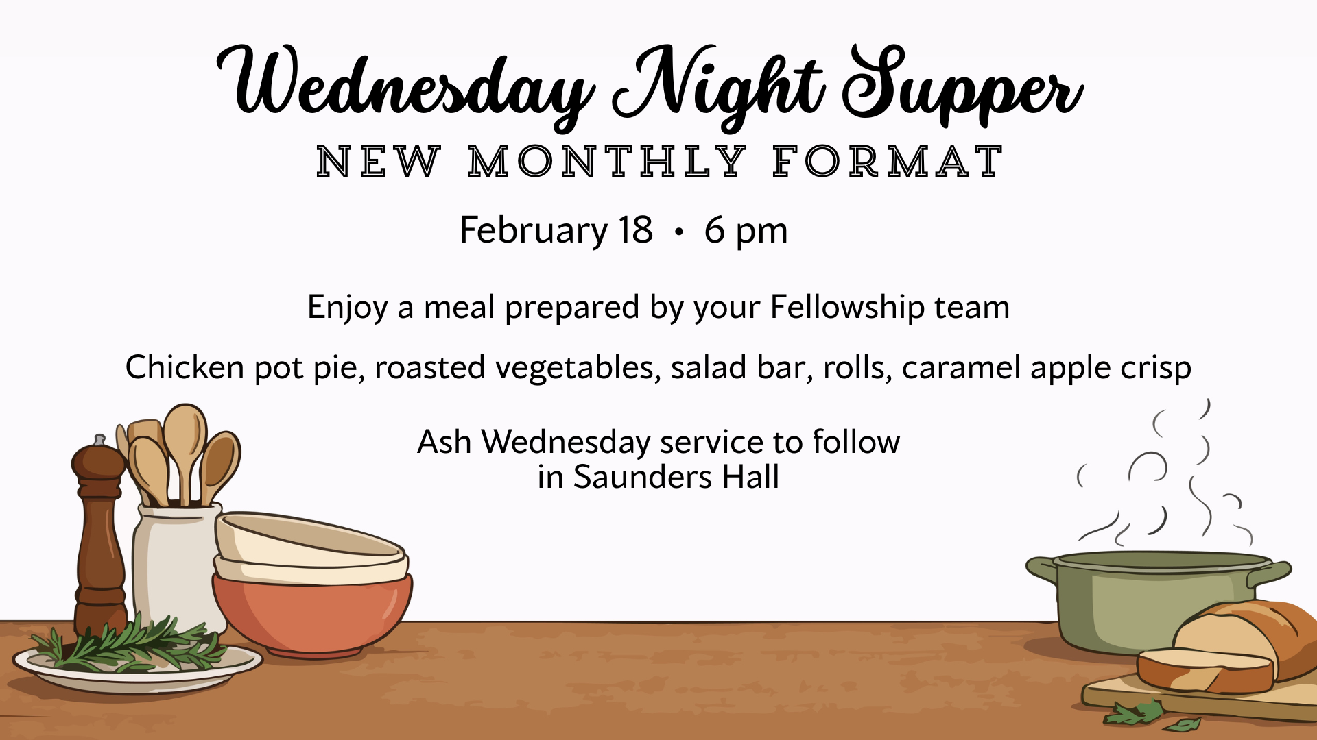 Wednesday Night Suppers will take place monthly in Spring 2026, on 2/18, 3/25, 4/22, and 5/6. Rather than a catered meal, your talented Fellowship team will be preparing special meals in February, March, and April. Our February supper is followed by the Ash Wednesday service, and our March supper is preceded by the Easter Egg Hunt. Our Boy Scout Troop will be grilling for us in May.